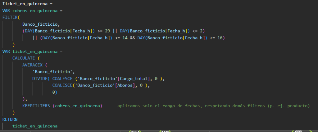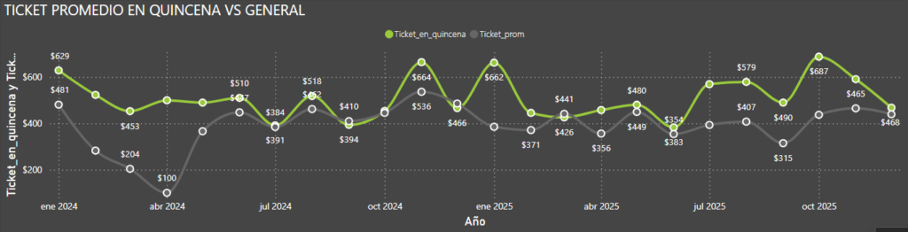 Con DAX es posible crear cálculos avanzados usando de variables para detectar patrones específicos, como tendencias en periodos concretos, por ejemplo el incremento del ticket promedio durante pagos de quincena.